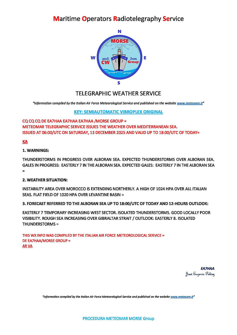 If you are interested in sending a weather report, record an MP3 file in the early morning by downloading the Meteomar text from the Official Air Force Site: (download HERE) for the Mediterranean Sea.